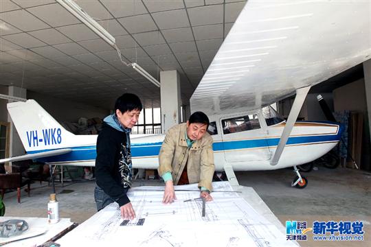 3月20日,模型設(shè)計(jì)家曹珉(右)和李志剛(左)在研究飛機(jī)模型圖紙