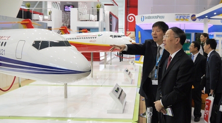 在中國商飛公司展區(qū),蘇波認(rèn)真察看了C919大型客機(jī)混合級布局以及ARJ21-700飛機(jī)混合級、全經(jīng)(jīng)濟(jì)級、行政機(jī)和公務(wù)(wù)機(jī)布局模型,聽(tīng)取了公司兩大型號的最新研制進(jìn)(jìn)展、能力建設(shè)、人才隊伍建設(shè)、國際合作、民機(jī)產(chǎn)(chǎn)業(yè)(yè)體系建設(shè)等方面情況的匯報。蘇波表示,中國商飛公司成立5年來(lái)取得的成績(jì)令人鼓舞,工信部將一如既往地支持中國商飛公司的發(fā)(fā)展建設(shè),希望中國商飛公司再接再厲、奮力拼搏,爭取早日取得大型客機(jī)項目的成功。