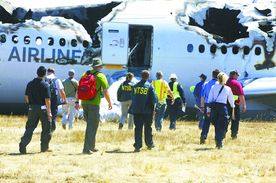 美國國家運(yùn)輸安全委員會(huì )調(diào)查人員在事故現(xiàn)場(chǎng)檢查飛機(jī)殘骸。