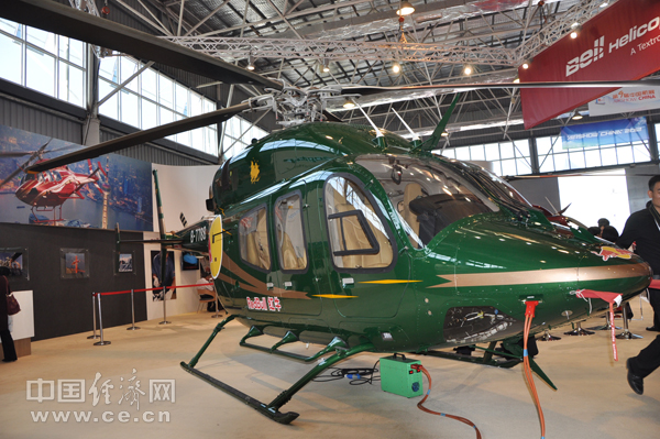 貝爾直升機(jī)公司展臺的直升機(jī) 中國經(jīng)(jīng)濟(jì)網(wǎng)(wǎng)記者 段丹峰 攝