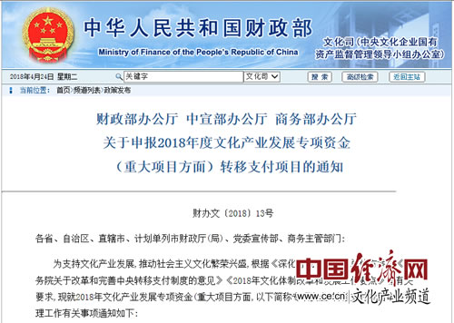 經(jīng)(jīng)濟(jì)日報(bào)-中國經(jīng)(jīng)濟(jì)網(wǎng)(wǎng)北京4月24日訊 近日,財(cái)政部辦公廳、中宣部辦公廳和商務(wù)(wù)部辦公廳聯(lián)(lián)合下發(fā)(fā)了關(guān)(guān)于申報(bào)2018年度文化產(chǎn)(chǎn)業(yè)(yè)發(fā)(fā)展專(zhuān)項(xiàng)資金(重大項(xiàng)目方面)轉(zhuǎn)移支付項(xiàng)目的通知(以下簡(jiǎn)稱(chēng)“通知”)。根據(jù)通知,專(zhuān)項(xiàng)資金將直接補(bǔ)助推動(dòng)(dòng)影視產(chǎn)(chǎn)業(yè)(yè)發(fā)(fā)展和對外文化貿(mào)易發(fā)(fā)展的重大項(xiàng)目。