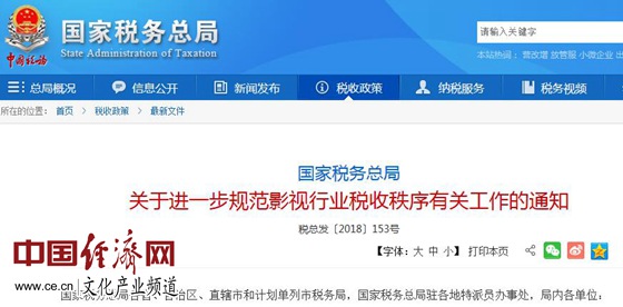 經(jīng)(jīng)濟(jì)日報-中國經(jīng)(jīng)濟(jì)網(wǎng)(wǎng)10月8日訊 記者從國家稅務(wù)(wù)總局網(wǎng)(wǎng)站獲悉,10月2日,國家稅務(wù)(wù)總局下發(fā)(fā)《國家稅務(wù)(wù)總局關(guān)(guān)于進(jìn)(jìn)一步規(guī)范影視行業(yè)(yè)稅收秩序有關(guān)(guān)工作的通知》(以下簡(jiǎn)稱(chēng)“《通知》”),進(jìn)(jìn)一步部署開(kāi)展規(guī)范影視行業(yè)(yè)稅收秩序工作。