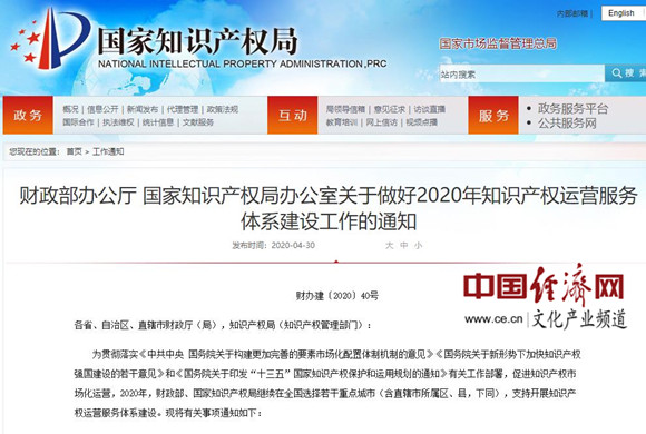財(cái)政部辦公廳 國(guó)家知識(shí)產(chǎn)(chǎn)權(quán)局辦公室關(guān)(guān)于做好2020年知識(shí)產(chǎn)(chǎn)權(quán)運(yùn)營(yíng)(yíng)服務(wù)(wù)體系建設(shè)工作的通知