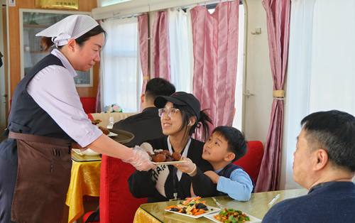 春運(yùn)首日鐵路天津客運(yùn)段值乘的T253次列車(chē)上餐車(chē)服務(wù)(wù)人員正在為旅客提供用餐服務(wù)(wù)。(楊寶森/攝)