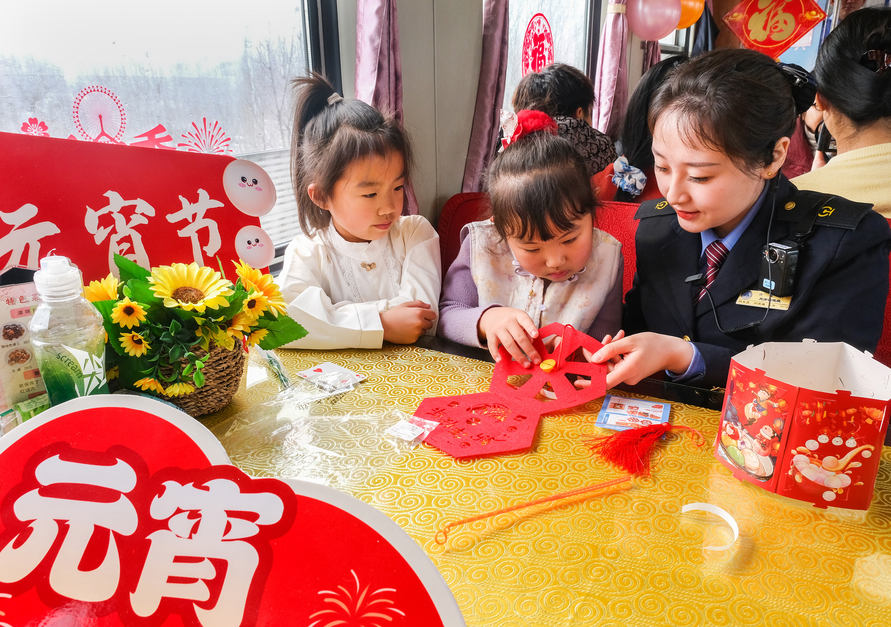 車(chē)廂內喜慶的節(jié)日裝飾暖意濃濃。乘務(wù)人員為旅客表演相聲、舞蹈等文藝節(jié)目,與旅客互動(dòng)猜燈謎、做花燈、吃元宵,車(chē)廂里滿(mǎn)是歡笑與溫情。