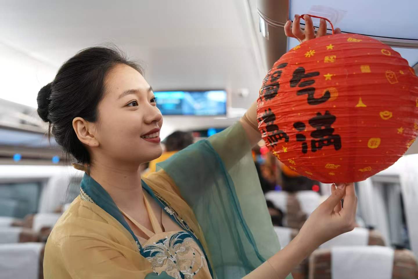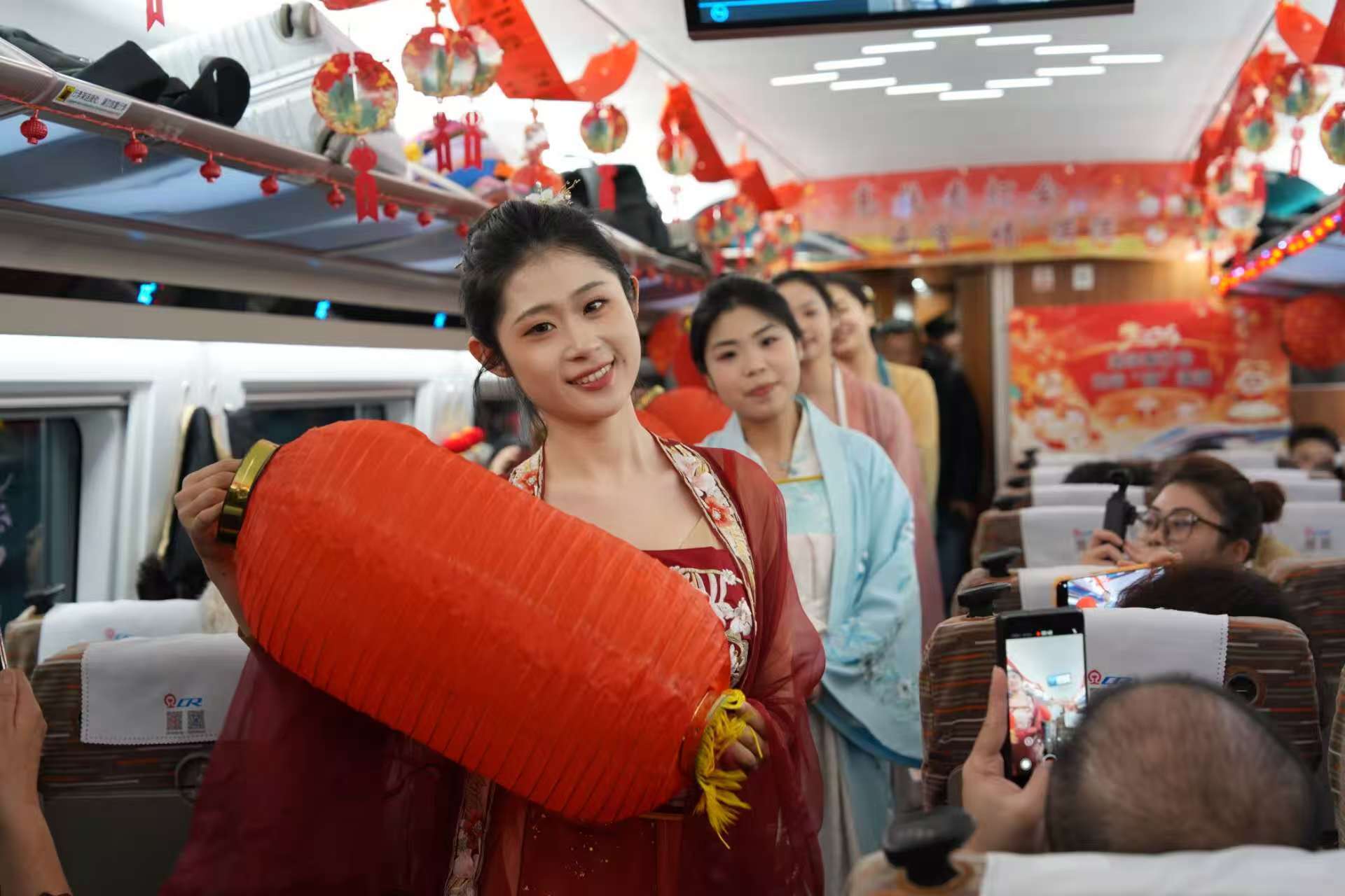 乘務(wù)人員身著(zhù)特色服飾,用紅燈籠裝點(diǎn)車(chē)廂。王滌非/攝