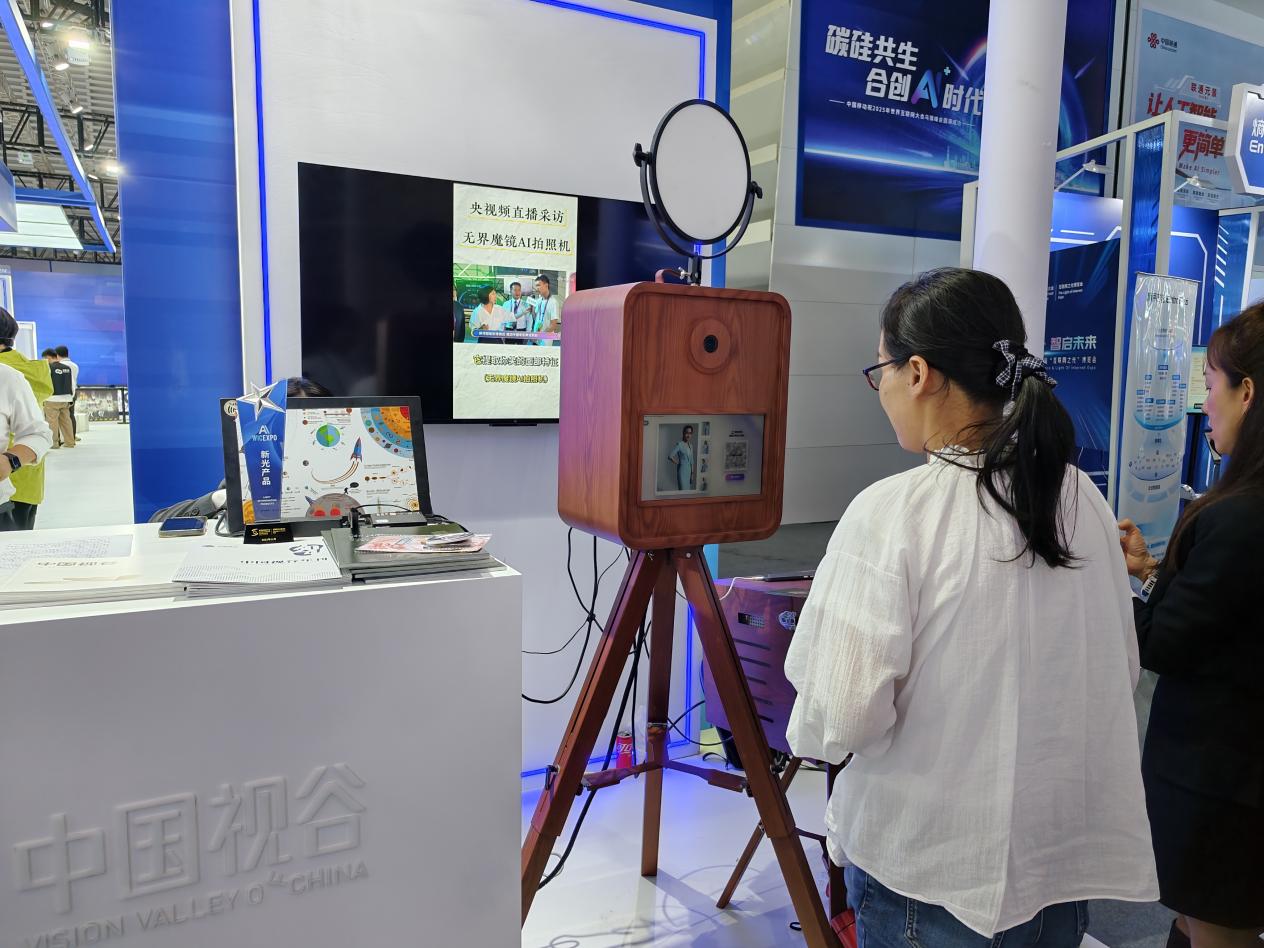觀(guān)眾體驗(yàn)中國視谷的無(wú)界魔鏡AI拍照機(jī),其內(nèi)置數(shù)百款風(fēng)(fēng)格迥異的寫(xiě)真模板,依托AI視覺(jué)大模型,具備強(qiáng)大的影像生成能力。中國經(jīng)(jīng)濟(jì)網(wǎng)(wǎng)記者李方/攝