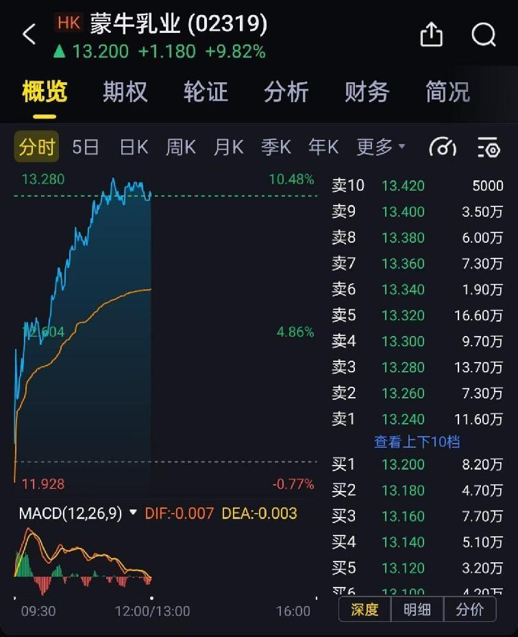 早盤(pán),蒙牛以11.92元小幅低開(kāi)后一路高漲,截至中午收盤(pán),蒙牛乳業(yè)(yè)報13.20元,上漲9.82%,成交4.64億元,成交量相較前一交易日顯著(zhù)放大。
