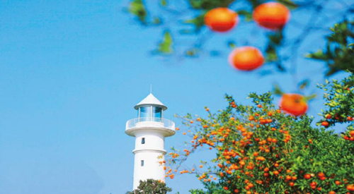 萬(wàn)州小桔燈生態(tài)(tài)文化旅游區(qū)的燈塔和紅桔(重慶水利局供圖)