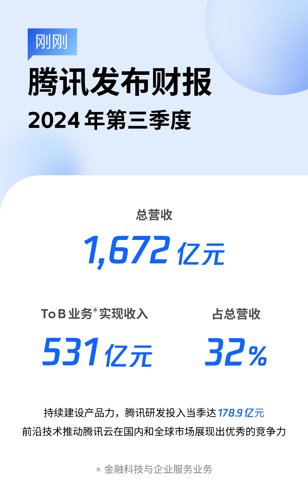 中國經(jīng)濟網(wǎng)北京11月14日訊(記者 李方) 11月13日,騰訊發(fā)(fā)布2024年Q3財報,當季度騰訊總營(yíng)收1672億元,同比增長(cháng)8%。騰訊ToB業(yè)(yè)務(wù)(金融科技及企業(yè)(yè)服務(wù))實(shí)現(xiàn)營(yíng)收531億元,占騰訊總營(yíng)收的32%。其中,企業(yè)(yè)服務(wù)的收入增長(cháng)受益于云服務(wù)和商家技術(shù)服務(wù)費推動(dòng),毛利受益于結構優(yōu)(yōu)化、效率提升獲得顯著(zhù)增長(cháng)。
