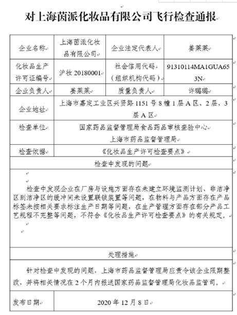 中國(guó)經(jīng)(jīng)濟(jì)網(wǎng)(wǎng)北京12月10日訊(記者 朱國(guó)旺 楊奇奇) 12月8日,國(guó)家藥監(jiān)局發(fā)(fā)布的對(duì)上海茵派化妝品有限公司飛行檢查通報(bào)顯示,該企業(yè)(yè)不符合《化妝品生產(chǎn)(chǎn)許可檢查要點(diǎn)(diǎn)》的有關(guān)(guān)規(guī)定。據(jù)國(guó)產(chǎn)(chǎn)非特殊用途化妝品化妝品備案平臺(tái)顯示,該公司為東方寶石、俊平、搖滾動(dòng)(dòng)物園、樂(lè )嬰堂、紅地球、稚優(yōu)(yōu)泉等化妝品品牌的生產(chǎn)(chǎn)企業(yè)(yè)。