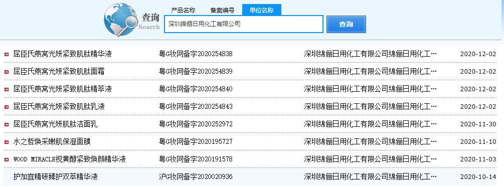 記者通過(guò)(guò)國(guó)產(chǎn)(chǎn)非特殊用途化妝品備案平臺(tái)查詢(xún)(xún)得知,深圳綿儷日用化工有限公司是屈臣氏燕窩光妍緊致肌肽精華液、歐薇蔻肌肽水光晶致面膜、護(hù)加宜精研臻護(hù)雙萃精華液等800多款產(chǎn)(chǎn)品的生產(chǎn)(chǎn)企業(yè)(yè)。