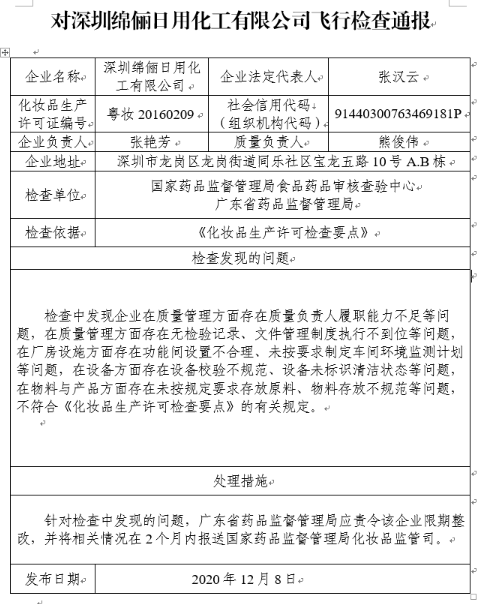 針對(duì)檢查中發(fā)(fā)現(xiàn)的問(wèn)(wèn)題,國(guó)家藥監(jiān)局要求廣東省藥品監(jiān)督管理局應(yīng)責(zé)令深圳綿儷日用化工有限公司限期整改,并將相關(guān)(guān)情況在2個(gè)(gè)月內(nèi)報(bào)送國(guó)家藥品監(jiān)督管理局化妝品監(jiān)管司。