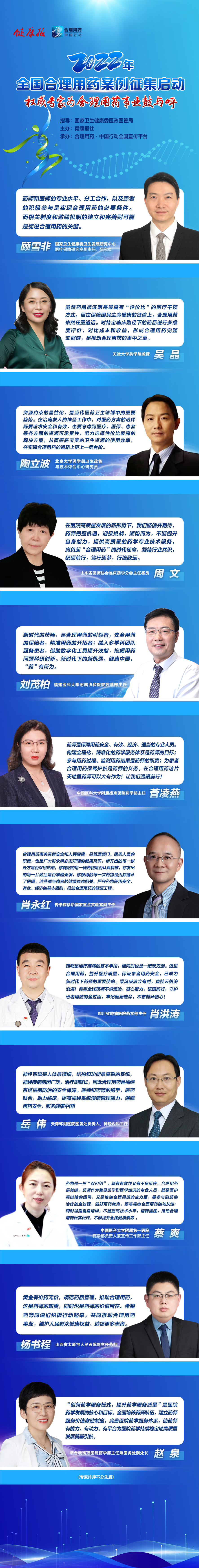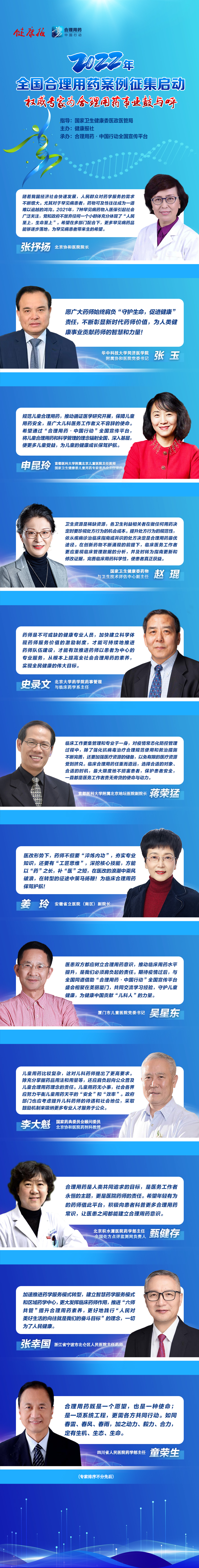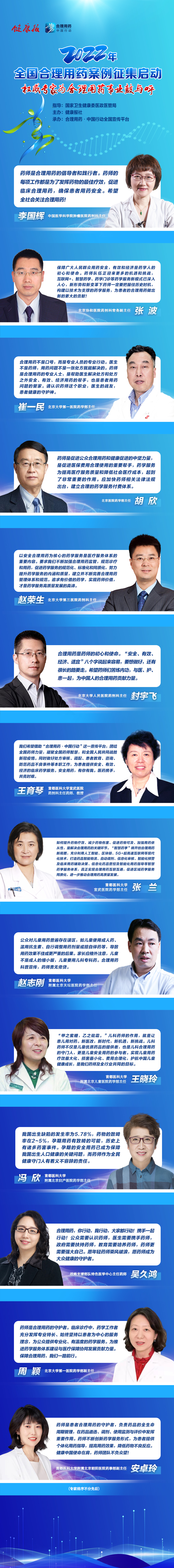 全國權(quán)威醫(yī)藥專(zhuān)家寄語(yǔ)合理用藥事業(yè)(yè),齊聚征集啟動(dòng)時(shí)刻,歡迎各地衛(wèi)生健康行政主管部門(mén)和醫(yī)療機構(gòu)積極報送案例。