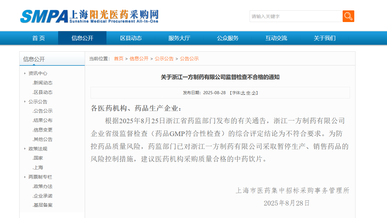 通知顯示,上海市醫(yī)藥集中招標(biāo)采購事務(wù)(wù)管理所提示各醫(yī)藥機(jī)構(gòu)、藥品生產(chǎn)(chǎn)企業(yè)(yè):根據(jù)2025年8月25日浙江省藥監(jiān)部門(mén)發(fā)(fā)布的有關(guān)(guān)通告,浙江一方制藥有限公司企業(yè)(yè)省級監(jiān)督檢查(藥品GMP符合性檢查)的綜合評定結(jié)論為不符合要求。為防控藥品質(zhì)(zhì)量風(fēng)(fēng)險(xiǎn),藥監(jiān)部門(mén)已對浙江一方制藥有限公司采取暫停生產(chǎn)(chǎn)、銷(xiāo)售藥品的風(fēng)(fēng)險(xiǎn)控制措施,建議醫(yī)藥機(jī)構(gòu)采購質(zhì)(zhì)量合格的中藥飲片。