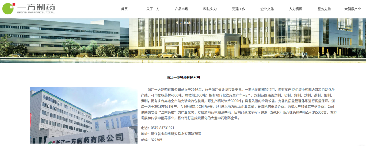 一方制藥官網(wǎng)(wǎng)介紹,浙江一方制藥有限公司成立于2016年,位于浙江省金華市磐安縣,公司于2018年5月投產(chǎn)(chǎn),7月獲得飲片GMP證書(shū),9月進(jìn)(jìn)入地方規(guī)上企業(yè)(yè)名單,是當(dāng)?shù)氐闹攸c(diǎn)(diǎn)企業(yè)(yè)、納稅大戶(hù)和誠實(shí)(shí)守信企業(yè)(yè)。天眼查顯示,國藥集團(tuán)香港有限公司為浙江一方制藥有限公司實(shí)(shí)控人。