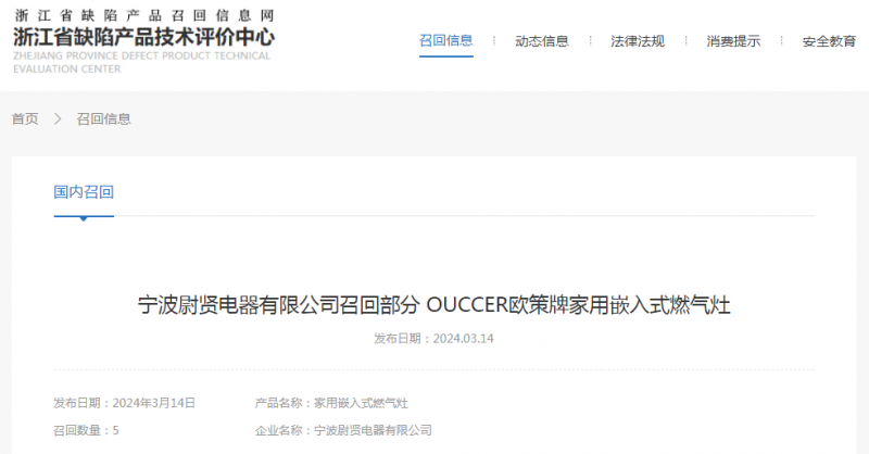 日前,寧波尉賢電器有限公司受缺陷調查影響按照《消費品召回管理暫行規(guī)定》的要求,主動(dòng)向浙江省市場(chǎng)監(jiān)督管理局和寧波市市場(chǎng)監(jiān)督管理局報告了召回計劃,將自即日起,召回2023年3月1日期間制造的OUCCER歐策牌JZY-OC20型號家用嵌入式燃氣灶,涉及數(shù)量為5件。