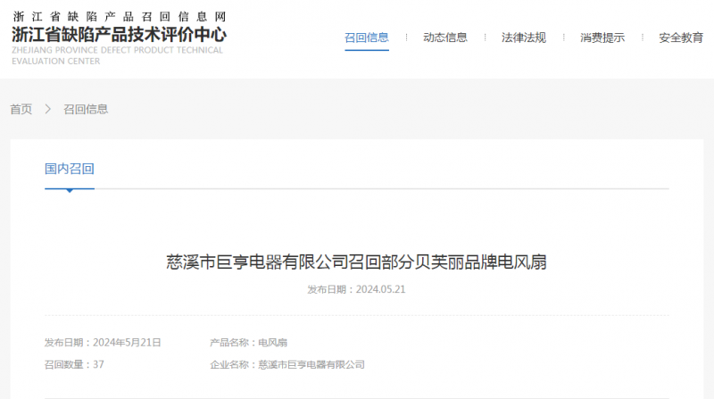 日前,慈溪市巨亨電器有限公司按照《消費(fèi)品召回管理暫行規(guī)定》的要求,主動(dòng)(dòng)向浙江省市場(chǎng)(chǎng)監(jiān)督管理局和寧波市市場(chǎng)(chǎng)監(jiān)督管理局報(bào)告了召回計(jì)劃,將自即日起,召回2023年5月15日至2023年6月10日期間制造的部分貝芙麗牌B280型號(hào)電風(fēng)(fēng)扇,涉及數(shù)量為37臺(tái)。