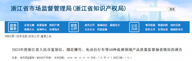 2024年6月12日,浙江省市場(chǎng)(chǎng)監(jiān)督管理局網(wǎng)(wǎng)站發(fā)(fā)布2023年度浙江省人民幣鑒別儀、煙花爆竹、電風(fēng)(fēng)扇、電動(dòng)(dòng)自行車(chē)等50種流通領(lǐng)(lǐng)域產(chǎn)(chǎn)品質(zhì)(zhì)量監(jiān)督抽查情況的通告。