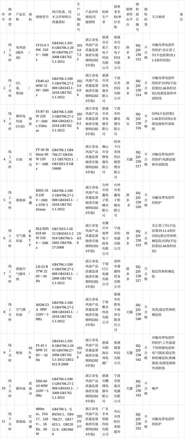 本次抽查了40批次電風(fēng)(fēng)扇產(chǎn)(chǎn)品,其中11批次產(chǎn)(chǎn)品不合格。不合格項(xiàng)目為對(duì)觸及帶電部件的防護(hù)、非正常工作、結(jié)構(gòu)、電源連接和外部軟線(xiàn)、發(fā)(fā)熱、穩(wěn)定性和機(jī)械危險(xiǎn)、工作溫度下的泄漏電流和電氣強(qiáng)度、機(jī)械強(qiáng)度、噪聲。