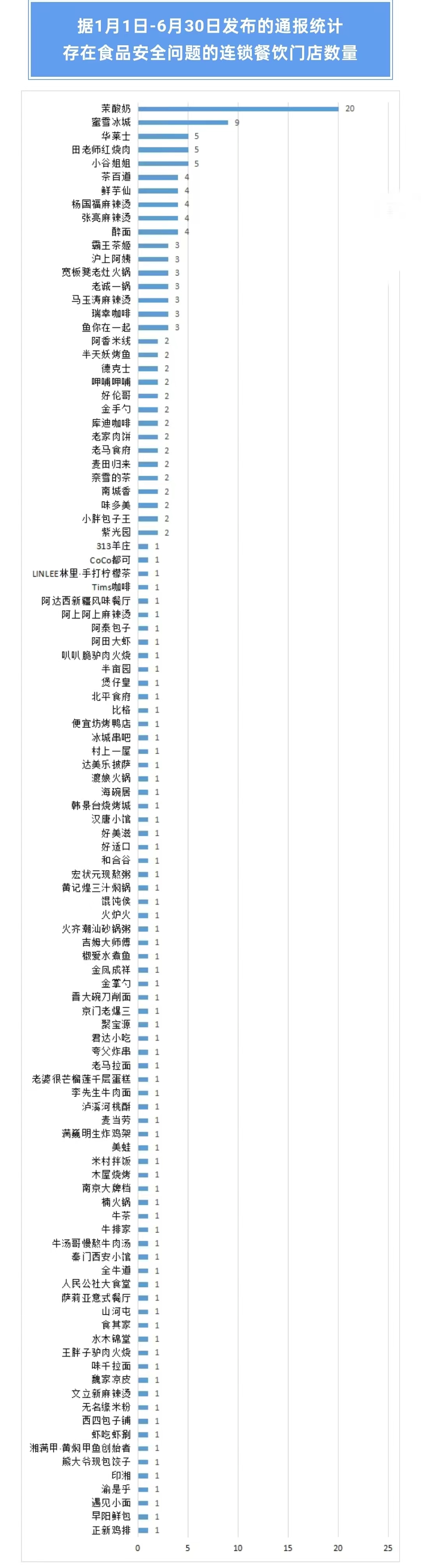 7月3日,北京市消費者協(xié)(xié)會(huì )公布今年1月1日至6月30日北京市市場(chǎng)監(jiān)管系統(tǒng)食品安全大檢查結果。結果顯示,茉酸奶有20家門(mén)店存在食品安全問(wèn)題,蜜雪冰城有9家門(mén)店存在食品安全問(wèn)題,華萊士、田老師紅燒肉、小谷姐姐、茶百道、鮮芋仙、楊國福麻辣燙、張亮麻辣燙、醉面等發(fā)(fā)現(xiàn)存在食品安全問(wèn)題的門(mén)店數(shù)量分列3到10位。