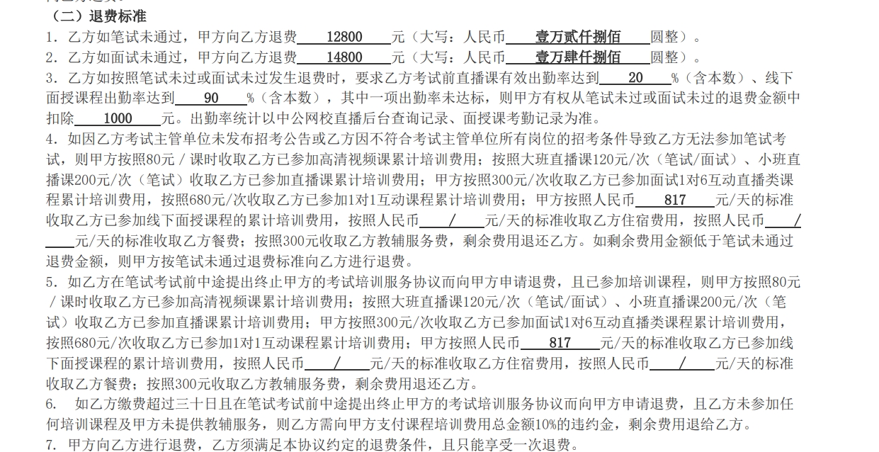 記者在武女士提供的其與中公教育簽訂的協(xié)(xié)議書(shū)里看到,符合出勤率等其他條件后,如果筆試或面試未通過(guò),中公教育將為學(xué)(xué)員全額退款。學(xué)(xué)員需在規(guī)定時(shí)(shí)間內(nèi)提交相關(guān)(guān)材料申請(qǐng)退費(fèi),中公教育核實(shí)(shí)所提交材料真實(shí)(shí)、符合退費(fèi)條件后,在30至45個(gè)(gè)工作日內(nèi)將約定的退費(fèi)金額支付至學(xué)(xué)員提供的銀行賬戶(hù)。