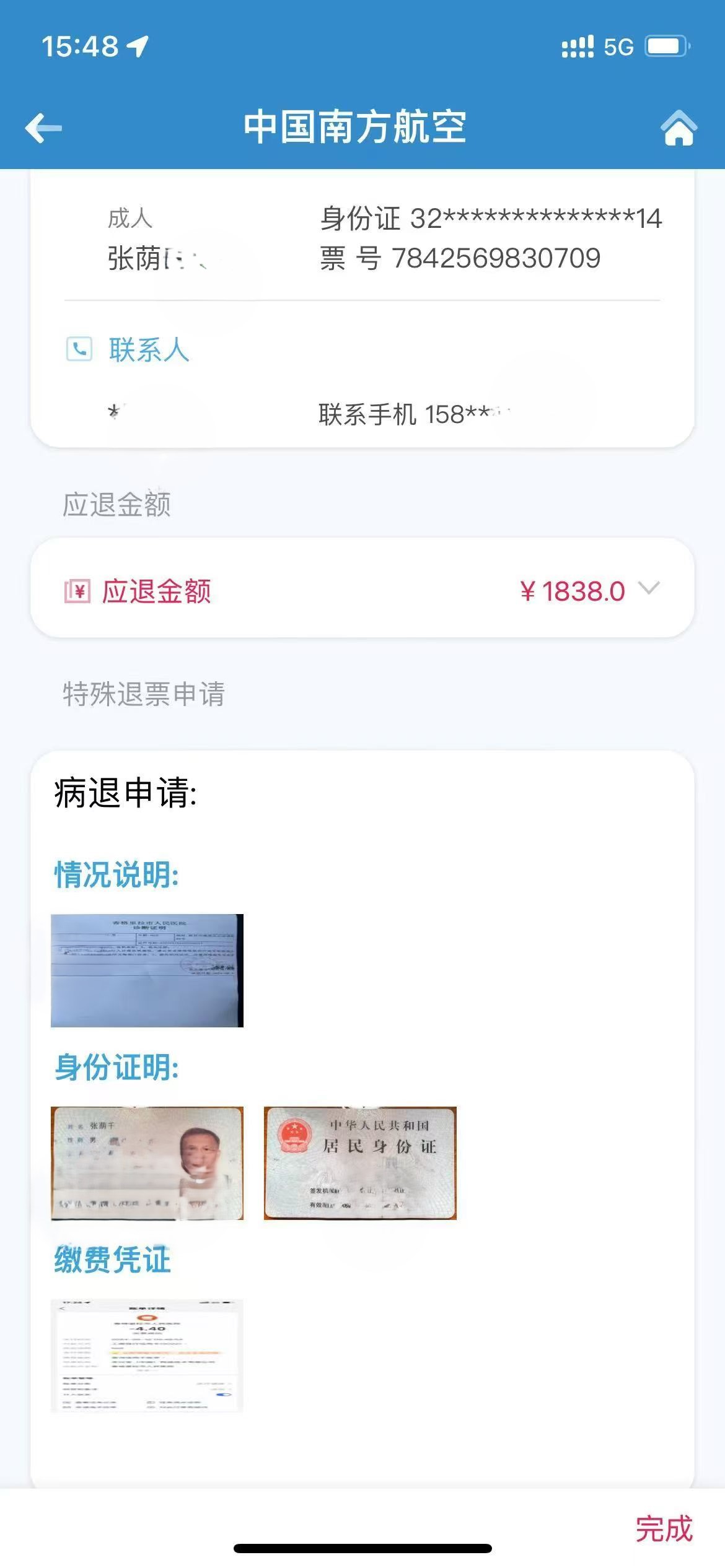 通過(guò)南航APP提交病退材料,只退回1838元。 消費(fèi)者張先生供圖