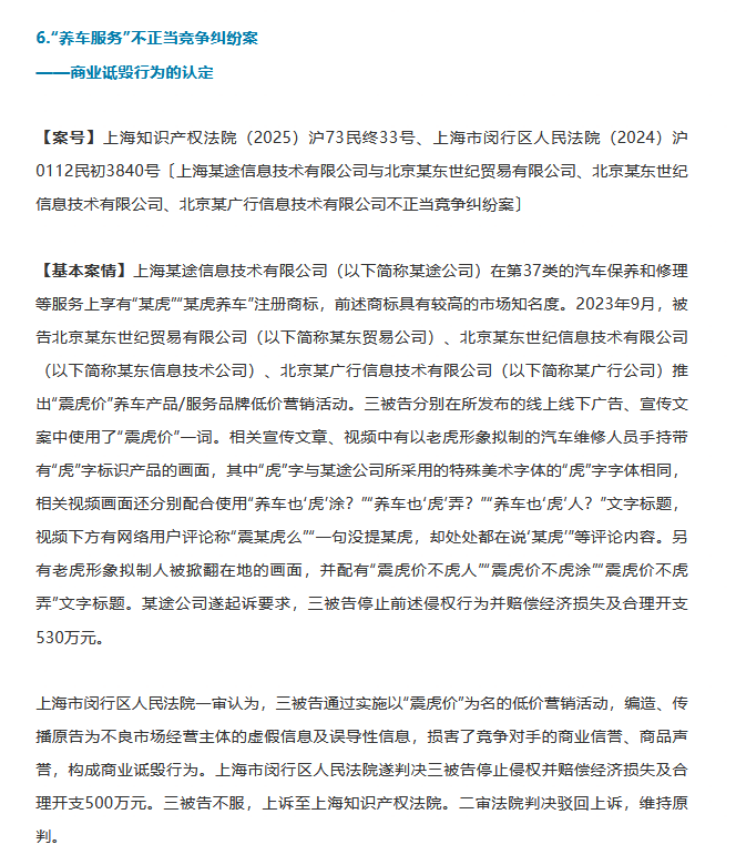 2025年9月8日,最高人民法院發(fā)(fā)布了八個(gè)(gè)反不正當(dāng)競(jìng)爭(zhēng)典型案例,其中影響較大的是上海知識(shí)產(chǎn)(chǎn)權(quán)法院二審、上海市閔行區(qū)人民法院一審判決的不正當(dāng)競(jìng)爭(zhēng)糾紛一案,案件的被告主體為北京京東世紀(jì)信息技術(shù)(shù)有限公司、北京汽廣行信息技術(shù)(shù)有限公司、北京京東世紀(jì)貿(mào)易有限公司(以下共同稱(chēng)“京東養(yǎng)車(chē)”),法院生效判決京東養(yǎng)車(chē)因商業(yè)(yè)詆毀與虛假宣傳構(gòu)成不正當(dāng)競(jìng)爭(zhēng),該判決為市場(chǎng)(chǎng)內(nèi)經(jīng)(jīng)營(yíng)(yíng)者之間的競(jìng)爭(zhēng)行為邊界提供了明確的司法指引,具有典型意義。