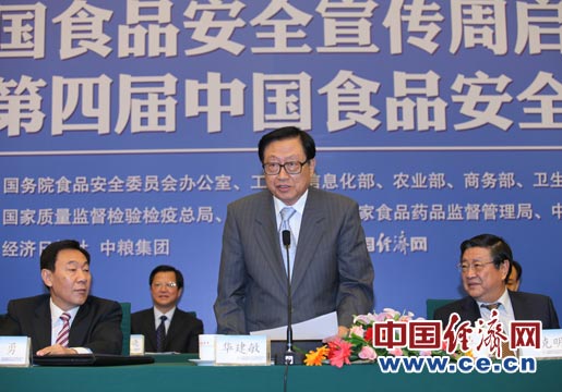 6月11日至17日被確定為今年的全國食品安全宣傳周。宣傳周主題為“共建誠信家園 同鑄食品安全”。全國食品安全宣傳周啟動(dòng)儀式由國務(wù)(wù)院食品安全委員會(huì )辦公室、工業(yè)(yè)和信息化部、農(nóng)業(yè)(yè)部、商務(wù)(wù)部、衛(wèi)生部、國家工商總局、國家質(zhì)(zhì)檢總局、國家糧食局、國家食品藥品監(jiān)管局、中國科協(xié)(xié)共同主辦,經(jīng)(jīng)濟(jì)日報社、中糧集團(tuán)承辦,中國經(jīng)(jīng)濟(jì)網(wǎng)(wǎng)執(zhí)行承辦。圖為全國人大常委會(huì )副委員長(cháng)華建敏宣布全國食品安全宣傳周啟動(dòng) 裴小閣攝