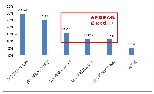 在認(rèn)為未來(lái)(lái)一年食品安全狀況會(huì)(huì )變差的市民中,有29.6%的市民信心降低了5%~10%,25.5%的市民信心降低程度低于5%,信心降低20%以上和信心降低16%~20%的市民相對(duì)較少,分別為11.8%和11.3%。
