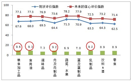 從未來(lái)(lái)發(fā)(fā)展趨勢(shì)來(lái)(lái)看,市民對(duì)蔬菜、水果的信心評(píng)價(jià)(jià)指數(shù)最高為78.2,其次是蛋及蛋制品為77.9,未來(lái)(lái)信心偏低的依然是零食、乳制品、飲料&酒和肉及肉制品。