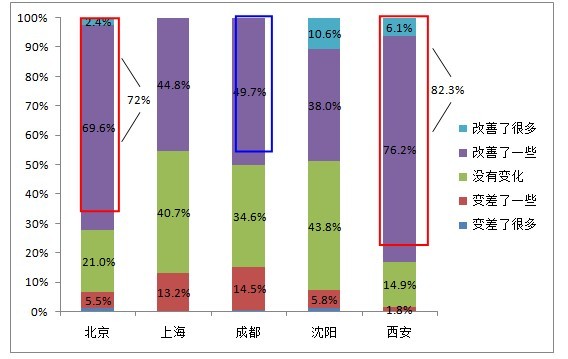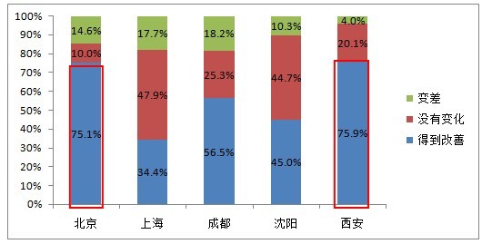 解讀一:過(guò)去一年,西安、北京對食品安全的改善情況最為滿(mǎn)意,成都最不滿(mǎn)意。