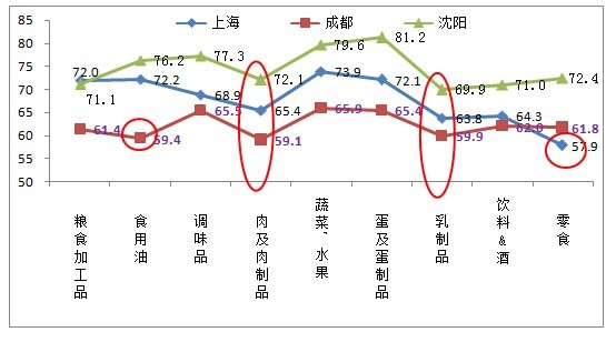 針對食品安全現(xiàn)狀信心指數(shù)較低的三個(gè)城市:上海、成都、沈陽(yáng)。沈陽(yáng)表現(xiàn)相對較好,信心指數(shù)較高;其次是上海;最低的是成都。其中肉及肉制品和乳制品在三大城市中的安全信心指數(shù)都相對偏低,直接影響了三大城市的綜合信心程度。此外,食用油在成都的安全信心指數(shù)、零食在上海的安全信心指數(shù)也有待提高。