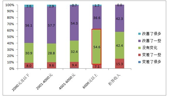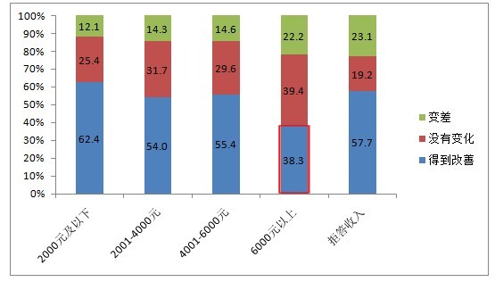 收入水平在6000元以上的市民,認為過(guò)去一年食品安全沒(méi)有改善的人數(shù)遠大于認為有所改善的人數(shù)?!?/P>