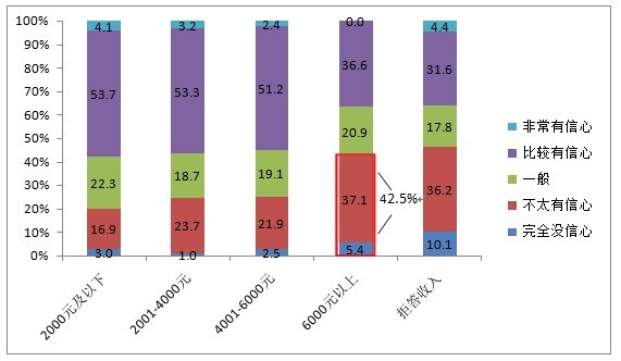 隨著(zhù)人們收入水平的提高,大家對于食品安全越發(fā)(fā)沒(méi)有信心,數(shù)據(jù)顯示,除了拒絕透露收入水平的人群外,6000元以上的高收入人群對現(xiàn)狀沒(méi)有信心的比例最高,超四成。