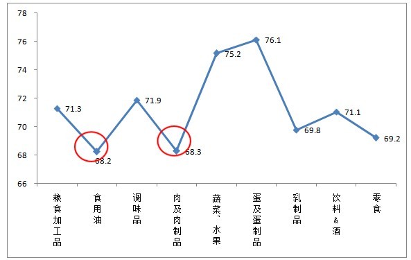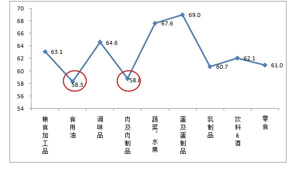 進(jìn)一步分析發(fā)(fā)現(xiàn),6000元以上高收入人群對食用油、肉及肉制品這兩類(lèi)食品的安全信心指數(shù)最低,直接影響了對食品安全現(xiàn)狀整體的信任度。