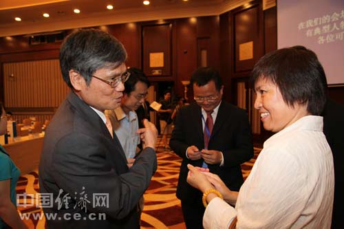 2013年全國食品安全宣傳周啟動(dòng)儀式暨第五屆中國食品安全論壇6月17日在北京舉辦,今年主題為“社會(huì )共治 同心攜手維護(hù)食品安全”。圖為康師傅中央研究所所長(cháng)楊乾輝與中國飲料工業(yè)(yè)協(xié)(xié)會(huì )理事長(cháng)趙亞利進(jìn)(jìn)行交流。 中國經(jīng)(jīng)濟網(wǎng)(wǎng) 郝紅波/攝