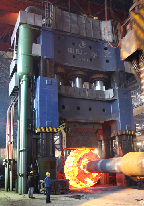 圖為榮獲國家科技進(jìn)(jìn)步一等獎、中國一重自行設(shè)計并制造的當(dāng)時(shí)國內(nèi)首臺、世界最先進(jìn)(jìn)的“新鋼鐵巨人”———1.5萬(wàn)噸自由鍛造水壓機(jī)工作場(chǎng)面。 李玉龍 攝影